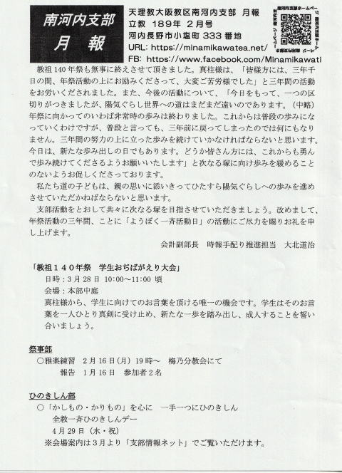 この度の年祭のパイプ椅子撤去は、下記の日時で行われますが、撤去当日、帰参予定がある場合などは、是非ともパイプ椅子撤去をお手伝い頂けたらと、お声掛けさせて頂く次第です。また、各支部内に於かれましても、広くお声掛け頂きたく重ねてお願い申し上げます。