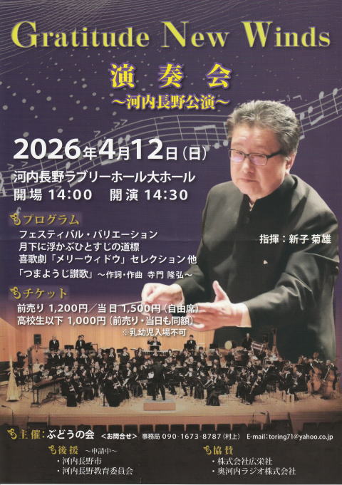 演奏は天理高校吹奏楽部OB・OGを中心にプロで活躍するメンバーが新子菊男の元に集結。すばらしい演奏となるでしょう。